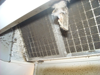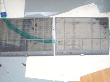 ![]() | エアコンフィルターの汚れ。 左側がクリーニング済みの為、ホースが見えますが右側のフィルターは見えません。 エアコン機器の性能を十分発揮させ、住んでいる方の人体や健康によくありませんのでお手入れをお勧めいたします |