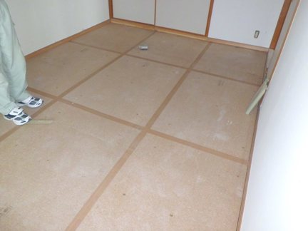 カーペットをはがし、フェルトの状態です。自然と蓄積された砂埃が中央に集中していることがわかります。 |