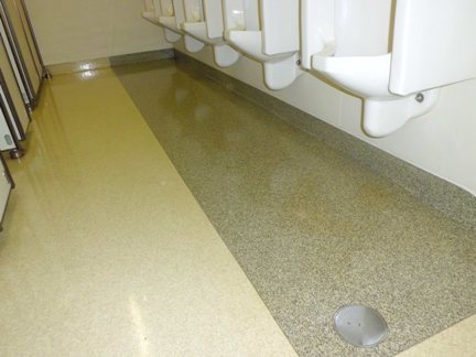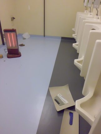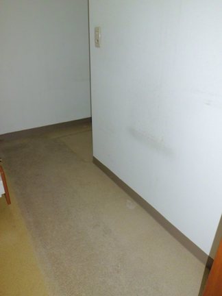 続いてコンクリートの床面にボンドで接着してあるフェルトをはがし、掃除を |