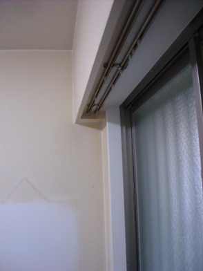 ![]() | 施工前。 カーテンレールをドライバーではずし、 カーテンボックスも巻き込みでクロスを 貼替ます。 |