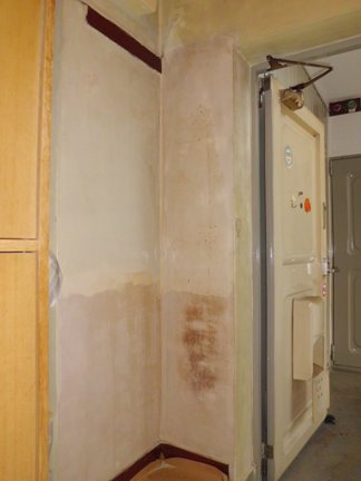 上の階のバルコニー付近より雨水被害によるクロス貼替 |
