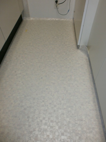 施工途中ですが、床シートの次に巾木を貼ります。冷蔵庫の移動も含まれています。