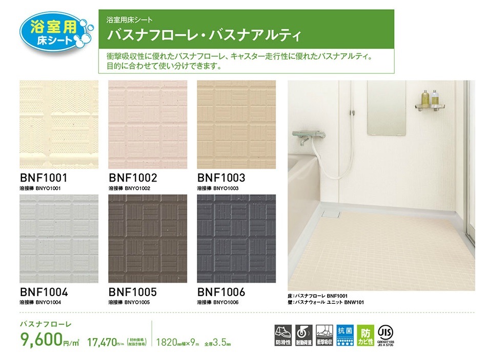 ![]() ![]() 製品サイズ 巾1,820㎜ 3,5㎜厚 ![]() ![]() ![]() 浴室の転倒による事故とヒートショックを軽減する商品です。 バスナフローレは、やわらかいクッション性を持つことで高い衝撃吸収性を発揮します。 また断熱性があるため、冬場の床の冷たさにより発生するヒートショックも軽減します。 バスナフローレを使用した浴室床のリフォームは、 バスナフローレは福祉用具情報システム(TAIS)に登録されています 介護保険給付について) 類似品 フクビ 「あんから」 |