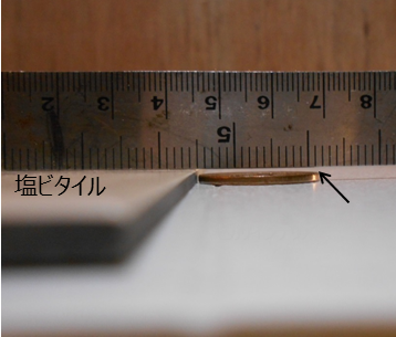 イメージしやすいように10円玉と比較しました。 塩ビタイルは10円玉よりも厚みがあります。 ![]() |