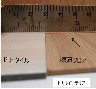 ![]() 矢印の隙間でわかるように、塩ビタイルより極薄フロアが薄いですね。 |