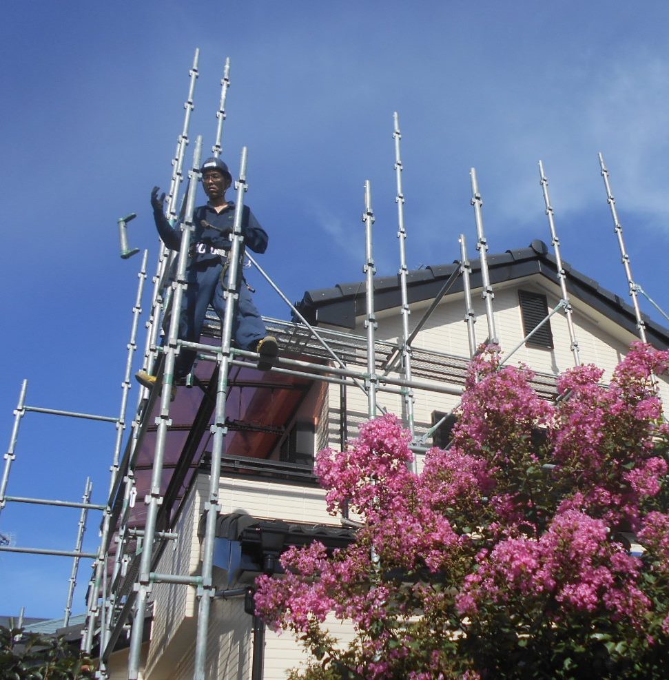※塗り替え工事が完了して足場の撤去日を迎えました。風が少しありますが、晴天で気持ちが良いです。足場屋さんの社長自ら現役のプレーヤーで頼もしい限りです。