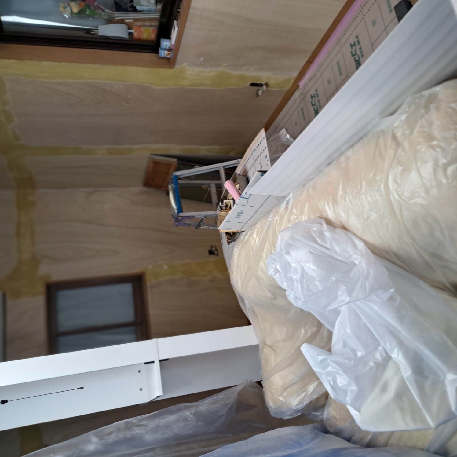 このままでは壁紙は貼れないのでベニア板を重ね貼りしたのち、壁紙を施工していきます。