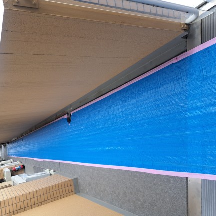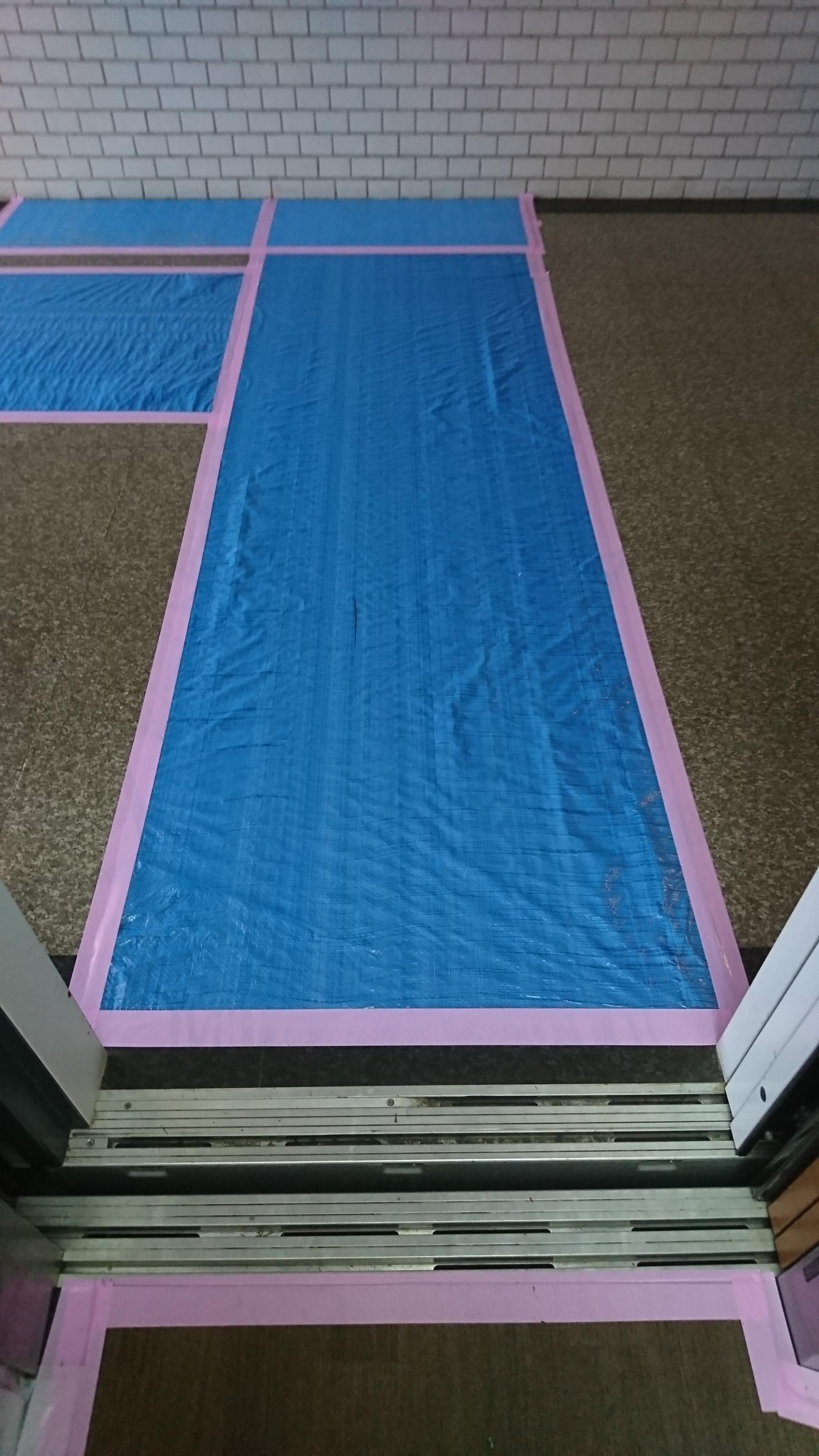 エントランスは養生ボード、通路はブルーシート、又は