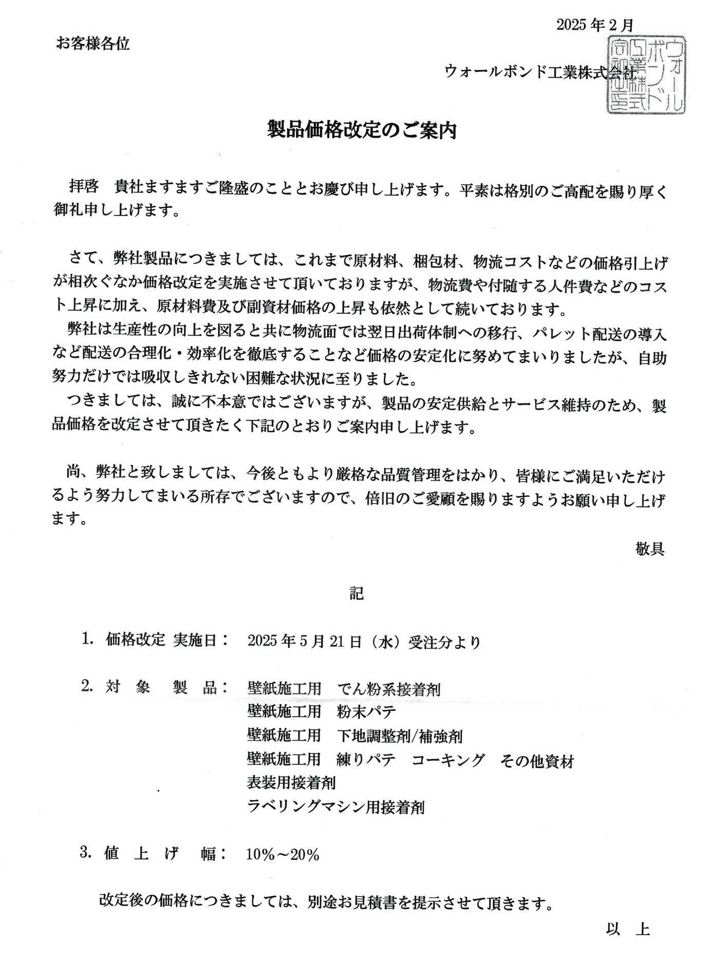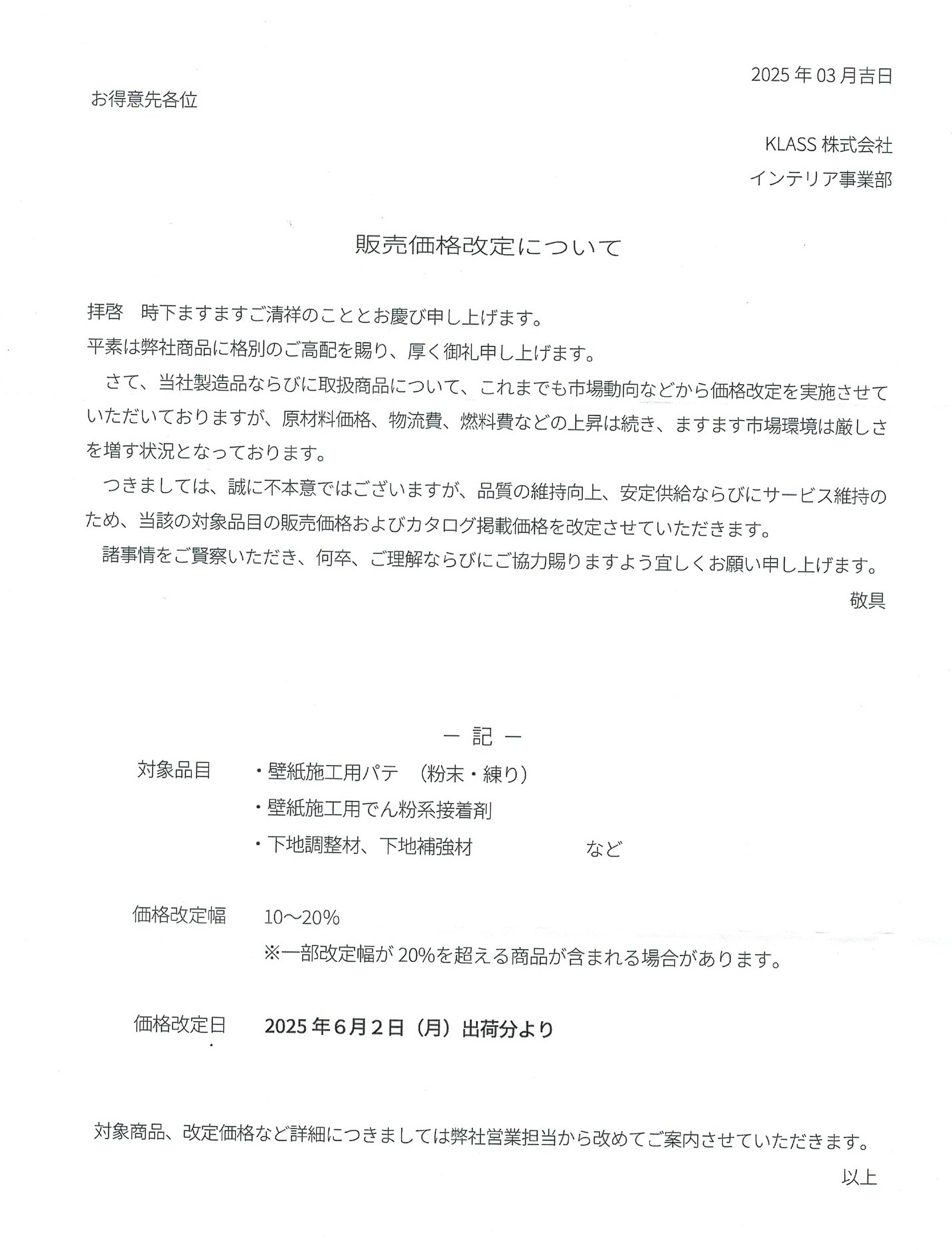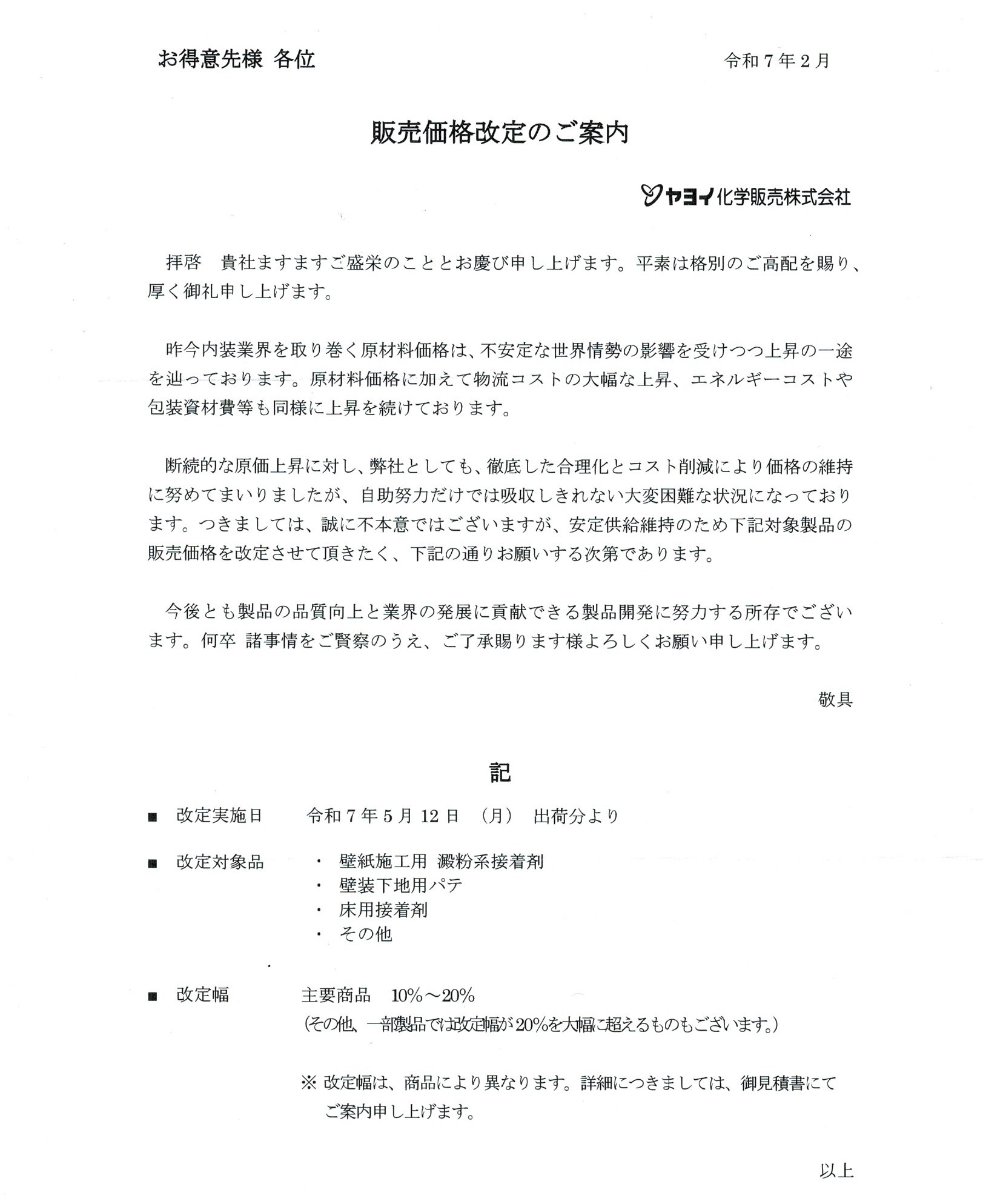 値上げのお知らせ |